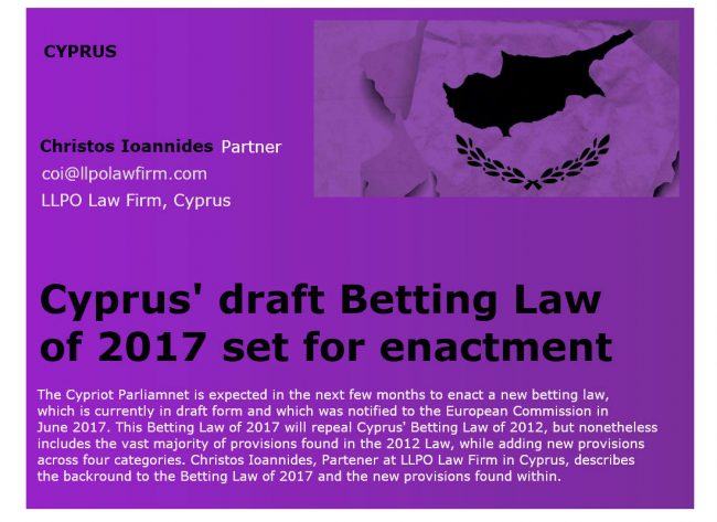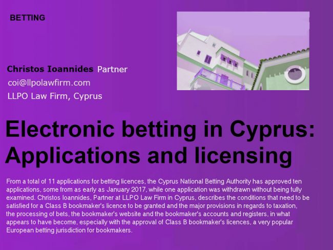Contributed by Christos O. Ioannides According to the Cyprus Betting Law 2012 electronic betting services are only to be provided by a person who holds a Class B bookmaker’s licence, issued following the submission of a relevant application to the National Betting Authority (henceforth the ‘Authority’). This licence authorises the provision of the electronic betting…